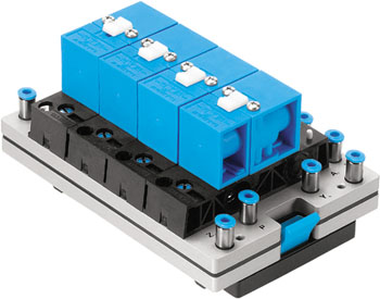 The stepper module is made up of a memory unit (3/2-way impulse valve), an AND and an OR component, a viewable announcement, and an auxiliary manual operation.