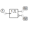 If there is an edge from 0 to 1 at input I of the positive edge-triggered monoflop, the output Q1 is set to 1 for a time t. After expiration of t, the output is reset to 0 automatically. A distinction is made between non-retriggerable and triggerable monoflops. With retriggerable monoflops, the cycle time t restarts with a new edge.